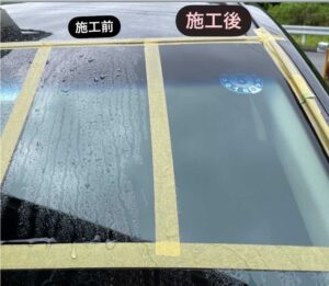 油膜をしっかり取り除いた後、コーティング施工。Afterの写真の通り、雨天でもしっかり水をはじき、視界がクリアな状態で運転していただけます。